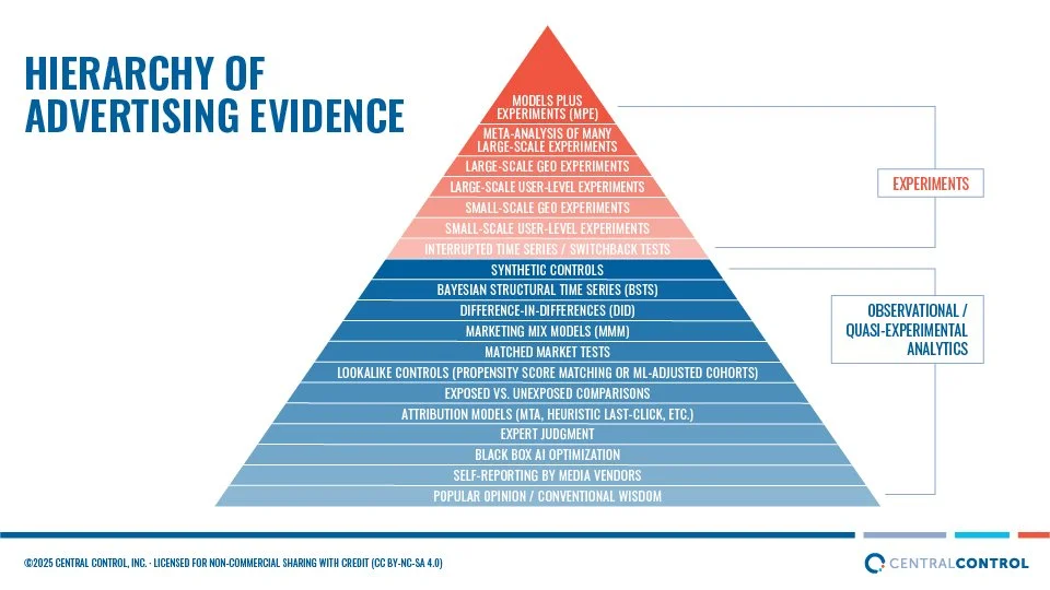 In medicine and other sciences, the “Hierarchy of Evidence” ranks research methods by the strength of their causal claims, with meta-analyses of randomized controlled trials at the top and anecdotal opinion at the bottom. Advertising faces the same challenge: separating true incrementality from correlation. This hierarchy adapts that framework to advertising, showing how experimental methods — ideally randomized controlled trials (RCTs) — provide the most credible evidence of causal impact. Quasi-experimental and observational approaches, such as marketing mix models, synthetic controls, or attribution, remain widely practiced and valuable, especially when experiments are impractical (e.g., in small national markets or for channels like in-store promotions). Still, because these approaches lack randomization, they depend on modeling choices and statistical assumptions that are harder to verify, and thus they are subject to bias, overfitting and provide less certain evidence of causal impact than experiments.