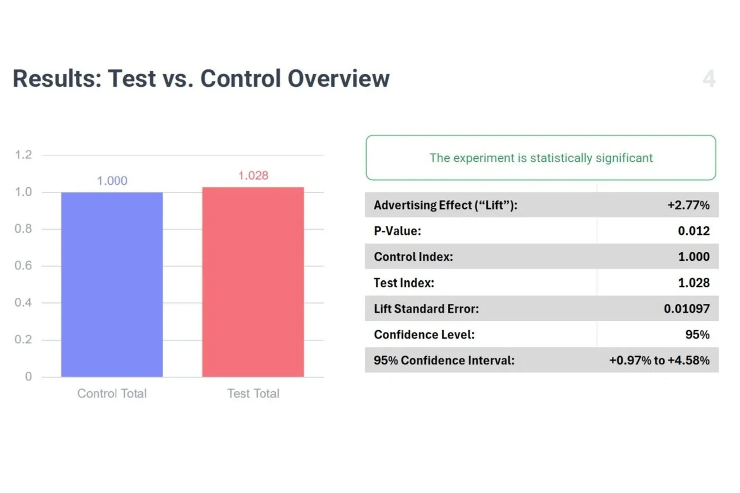 Ideally, results should look like: “Estimated lift = 5%, p = 0.04, 95% CI = +0.2% to +9.8%.” The p-value tells us the result just clears the 95% confidence level (so the false-positive risk is controlled at 5%). The CI tells us the range is fairly wide: the true lift could be as small as +0.2% or as large as +9.8%. So, even with a test that is "significant" at a 95% CL, the actual sales impact could vary widely, which is key for ROI. The measured effect size is really just a point estimate.