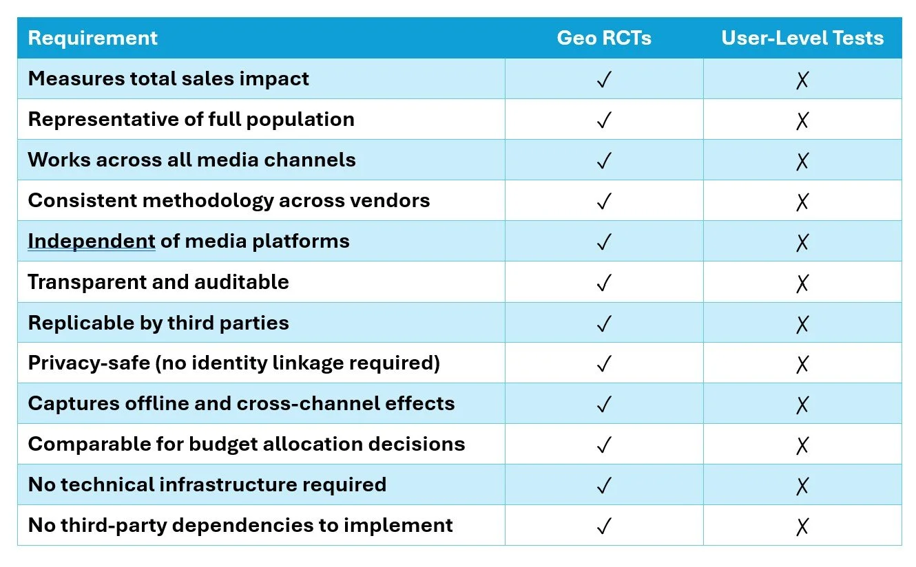 User-level tests still have a role. They are useful for creative and audience diagnostics within a platform, and for testing messaging among existing customers. But for the primary question, does this channel drive incremental sales, and how does it compare across the media mix, geo RCTs provide the more reliable answer.