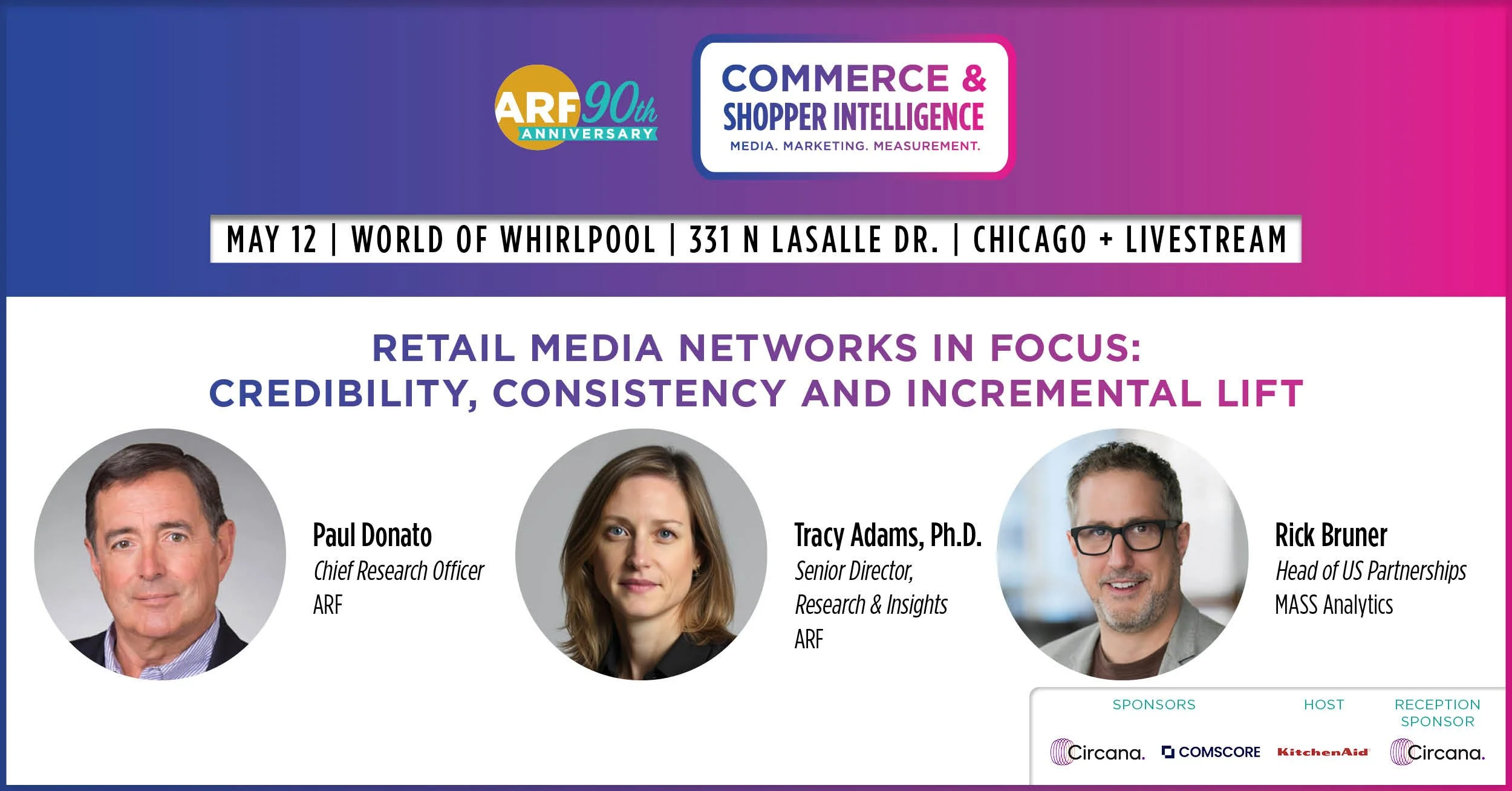 He’s keeping great company in his session: ARF's Chief Research Officer Paul Donato and its Senior Director of Research and Insights, Tracy Adams, PhD, talking about "Retail Media Networks in Focus: Credibility, Consistency and Incrementality."